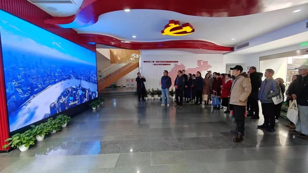 我会五位骨干成员与各地作家首先参观了新时代长三角一体化示范区党建创新实践基地,通过讲解员介绍,了解了党建引领、干部工作、人才服务新模式,以及在城市治理、生态绿色、重大项目、民生保障等方面的重要举措,通过视频、图文模式一一展示,使大家对长三角示范区建设成果的深度认知有了进一步提高,为今后的创作带来更多新知识,新高度。
