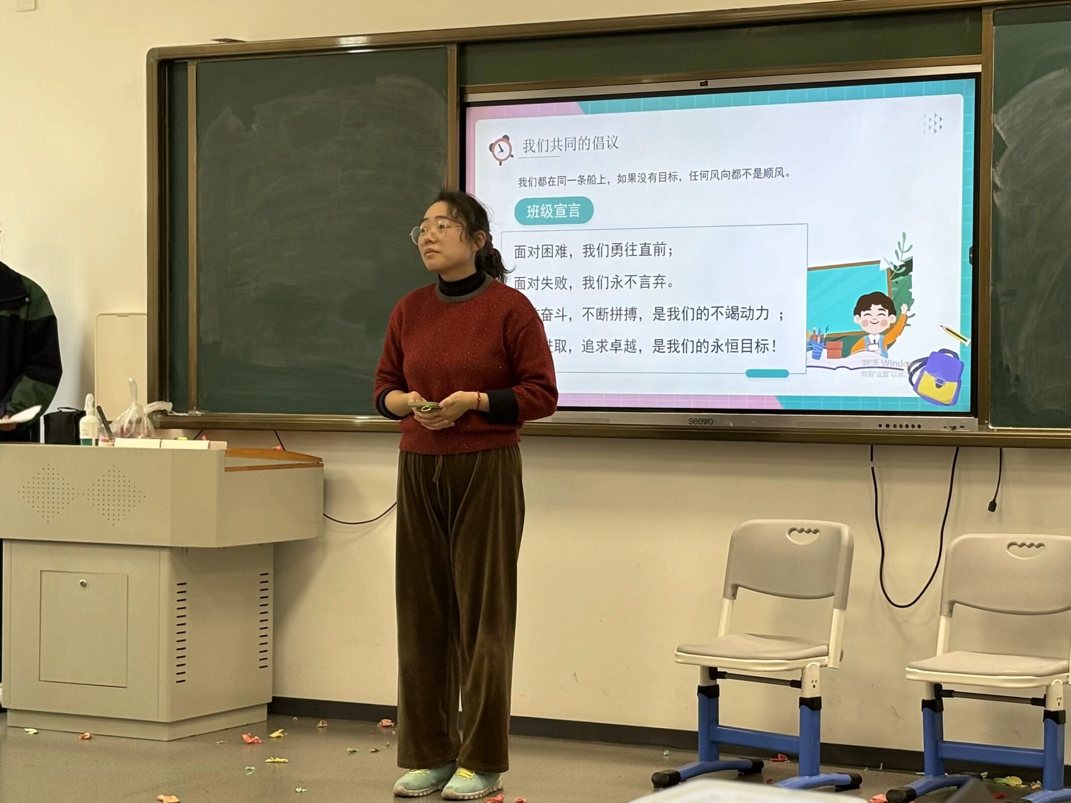 李薇老师用“强国有我”的阅兵视频,让学生初步理解凝聚力的重要性。结合学生的情况及班级现有问题,使学生明白了班集体荣誉感的重要性,了解良好班集体的评价标准,明确奋斗目标,收获奋斗成果,建立班级文化,使学生在践行班级活动的过程中建立班级荣誉感,在“搬气球”等团队游戏中,进一步提升凝聚力。