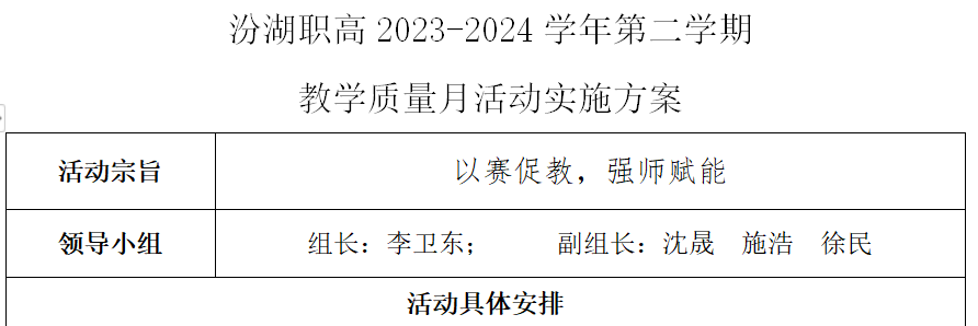 根据吴江区2024年度中等职业学校“教学质量月”活动通知的要求,实现教学内容的呈现方式、教师的教学方式和学生学习方式的变革,使课堂教学进一步适应职中学生发展和实践技能培养的需要,结合我校实际,经研究决定,三四月开展主题为“竞技中锤炼,赋能中成长”的活动,学校全体青年教师积极参与。