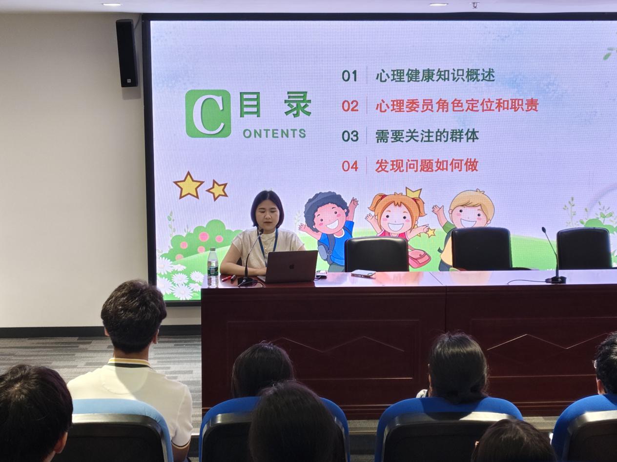 为更好的贯彻落实“润心”专项行动,进一步推进学校心理健康教育,提高同伴心理互助的意识和能力,充分发挥班级心理委员的作用,9月6日中午,我校对全体心理委员进行了培训活动,本次培训由我校专职心理老师周晓慧主讲,全校50名心理委员参加。