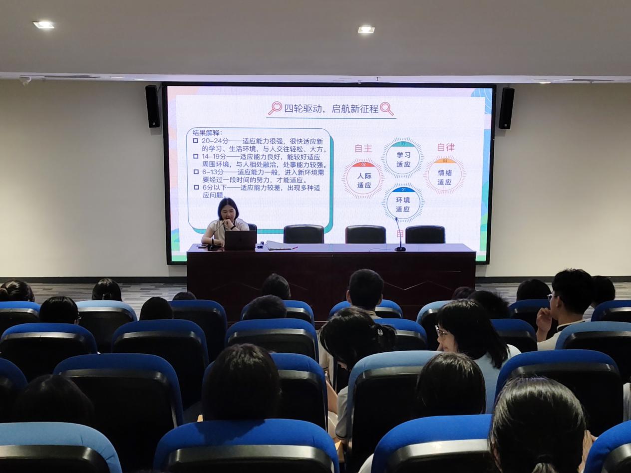 讲座从欢快的“看字说游戏”开始,介绍了常见的新生适应性问题,最后提出了“四轮驱动”法帮助学生提升适应性能力值