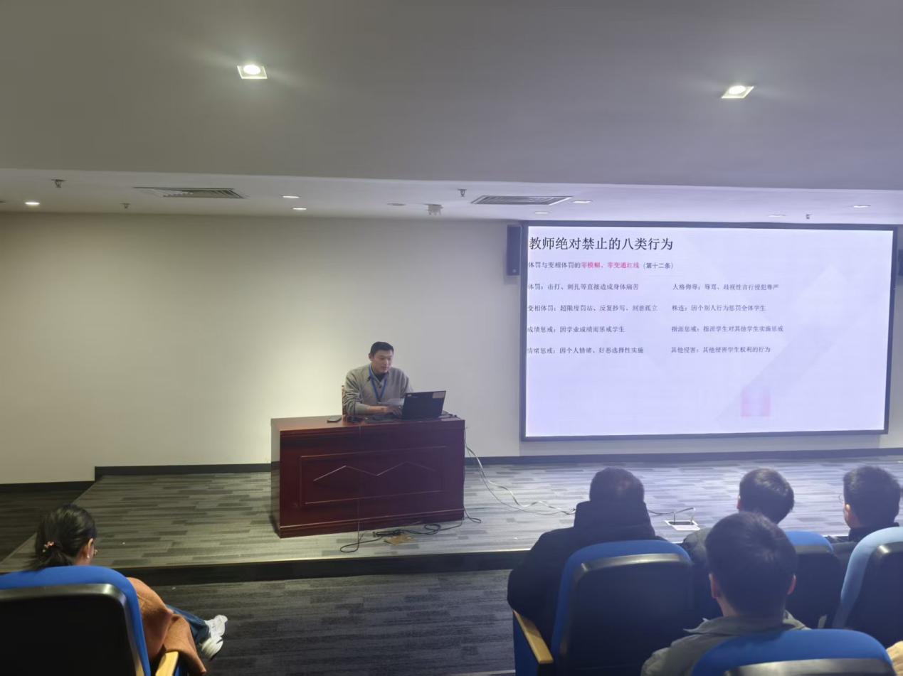 活动中,于明珠老师围绕规则核心内容,结合职业教育学生特点展开系统解读。他从教育惩戒的定义、适用情形、实施原则入手,重点梳理了课堂即时惩戒、较重情形惩戒、严重情形惩戒等不同层级的具体措施,明确了点名批评、公益服务任务、训导教育等合规惩戒方式的适用场景。同时,于老师着重强调了规则中禁止体罚、变相体罚、辱骂学生等刚性要求,结合典型案例剖析了教育惩戒与侵权行为的界限,引导教师坚守依法育人底线。